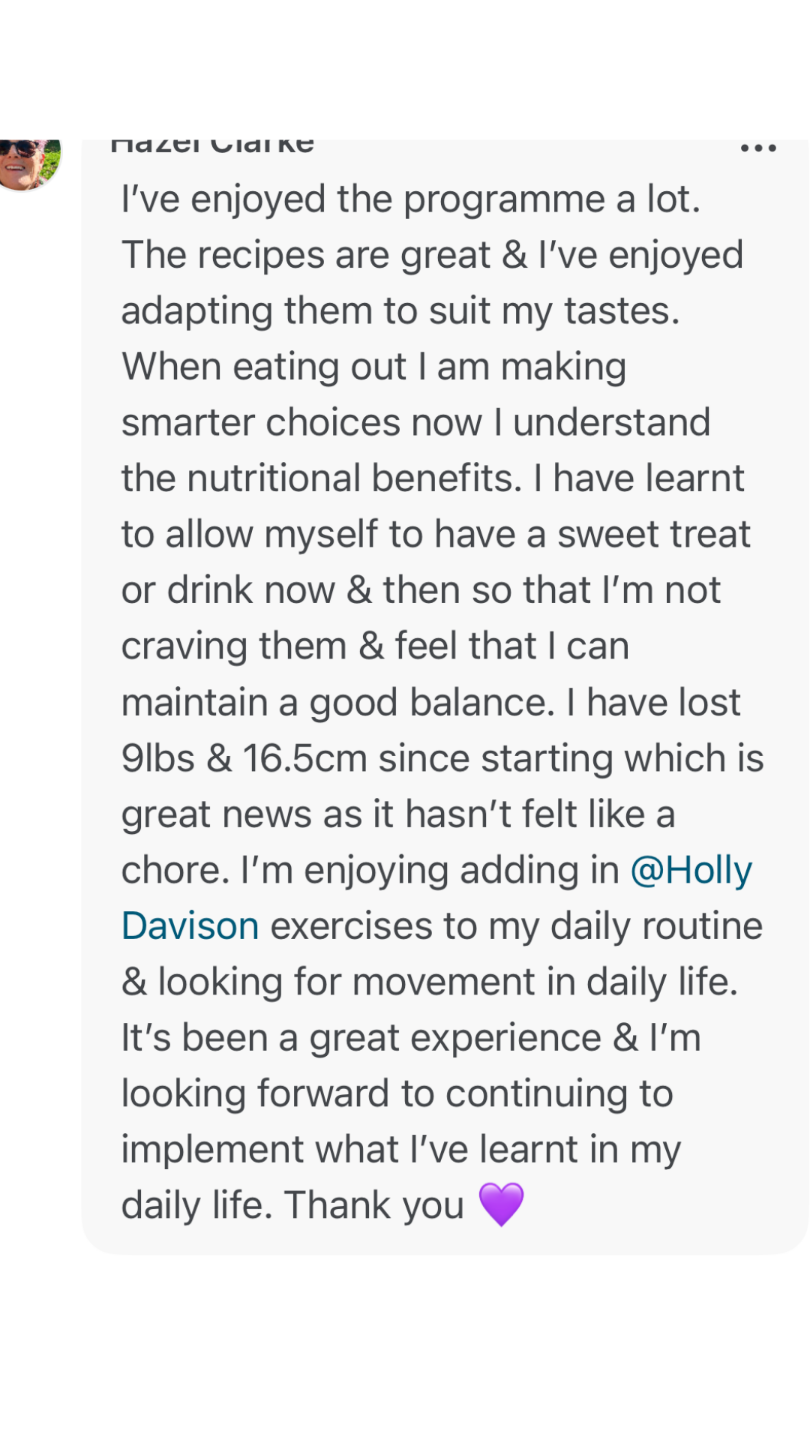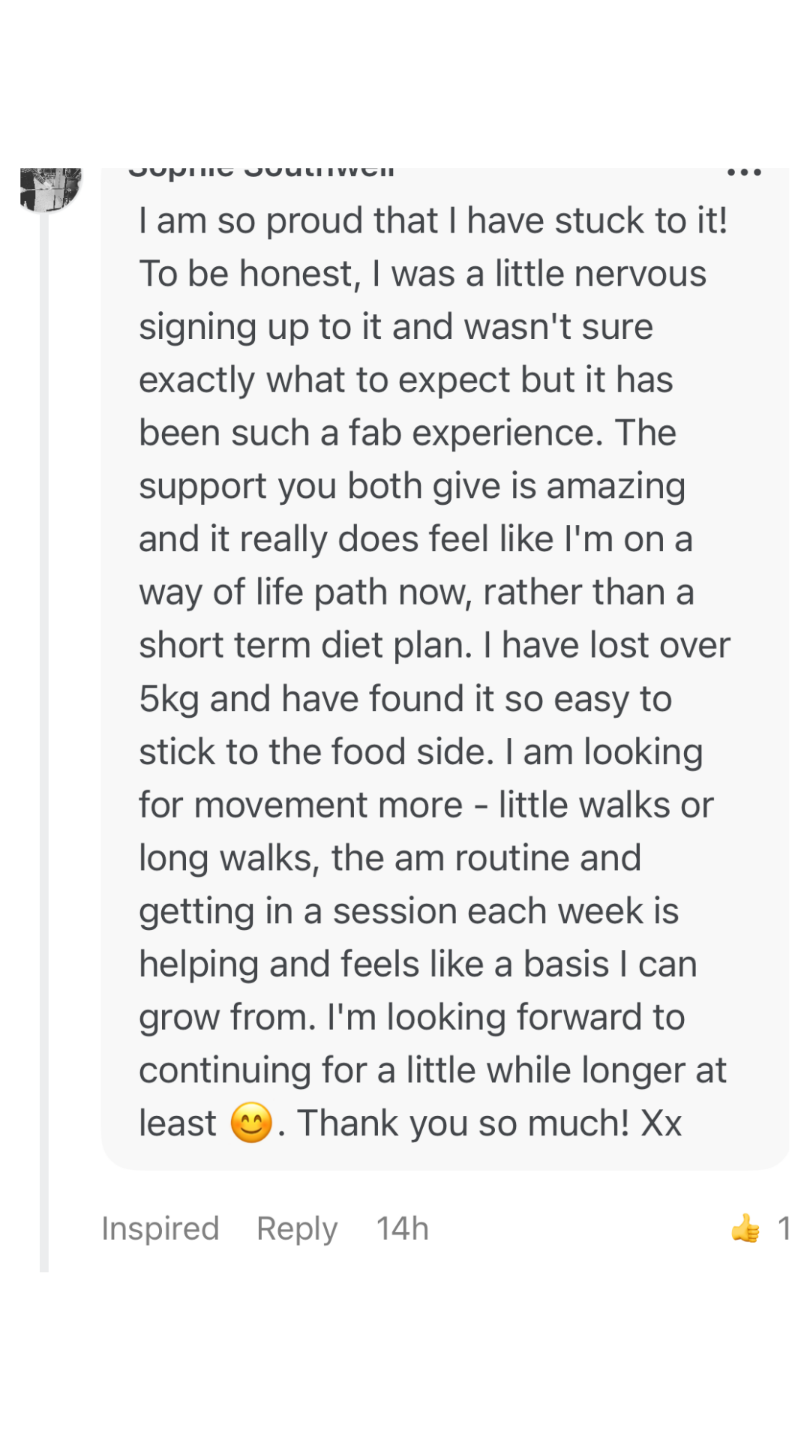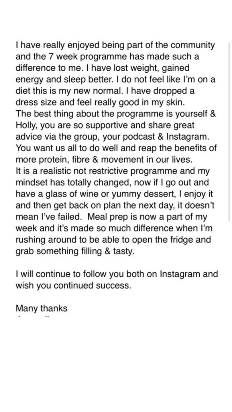 When you join, you'll benefit from bi-weekly one-to-one check-ins via email, where you'll receive individual feedback, coaching, and tailored support. While this isn’t a one-to-one coaching programme with private calls, you’ll still get direct input from both me (your nutrition coach) and your personal trainer throughout the 7 weeks.